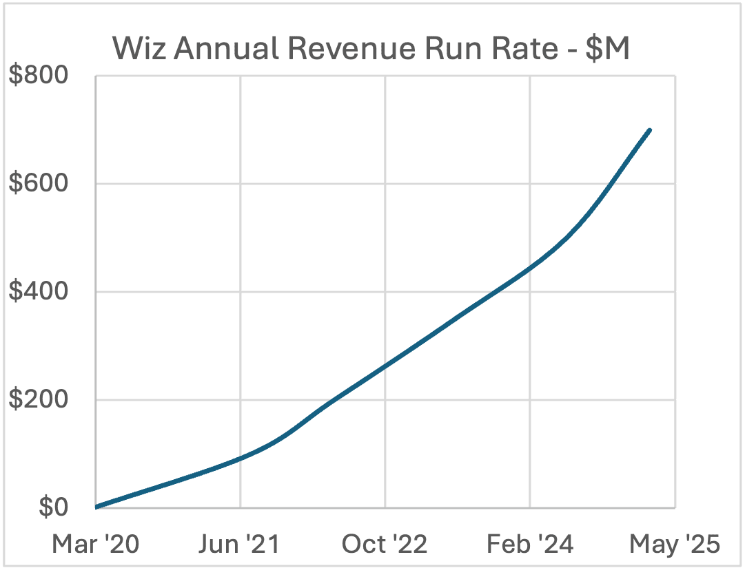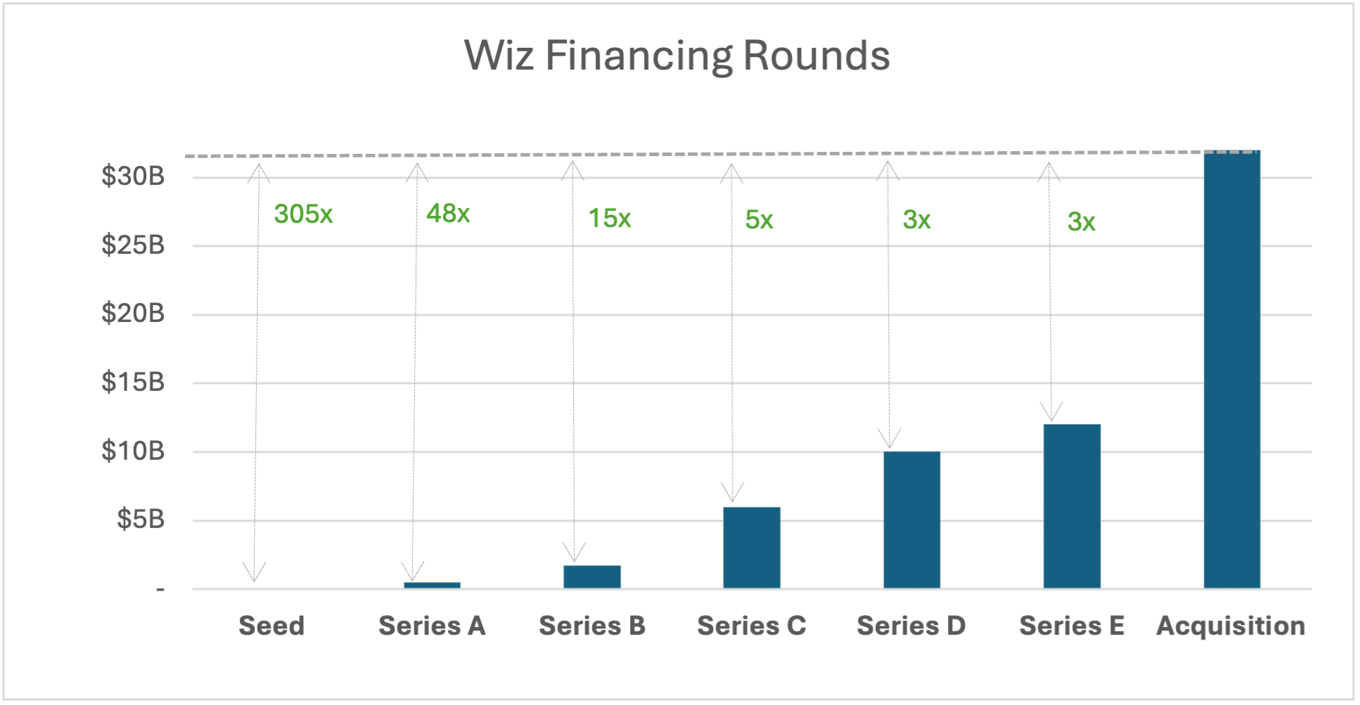 In March 2025, Google announced that it would acquire Wiz for $32B. This was the largest acquisition of a venture backed company ever, and what’s more, it happened in record time – only 5 years after the company was founded. Index Ventures, one of the early backers of Wiz is estimated to have turned the $43.5M early-stage investments it made in 2020 into $3B!!! … a 70x return in 5 years, or a 120% IRR.* The seed round by itself would have generated around 300x for Index, Cyberstarts and Sequoia, the early backers of the Company.